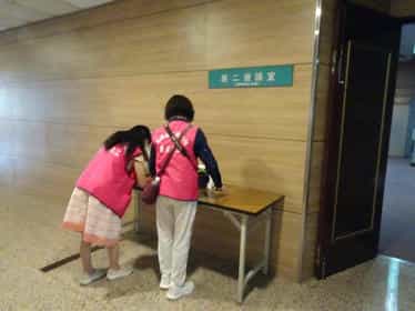 退輔會高雄榮民總醫院舉辦公職人員財產申報及利益衝突迴避法宣導說明會課程-廉政志工協助課程場地佈置等庶務實況。