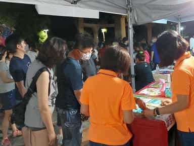苗縣政風處邀民眾「2022頭份四月八靚燈好客節」鬧客庄倡廉潔-志工認真與民眾說明宣導