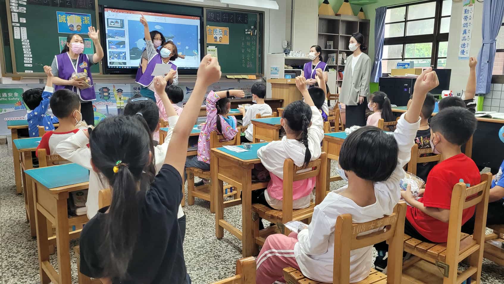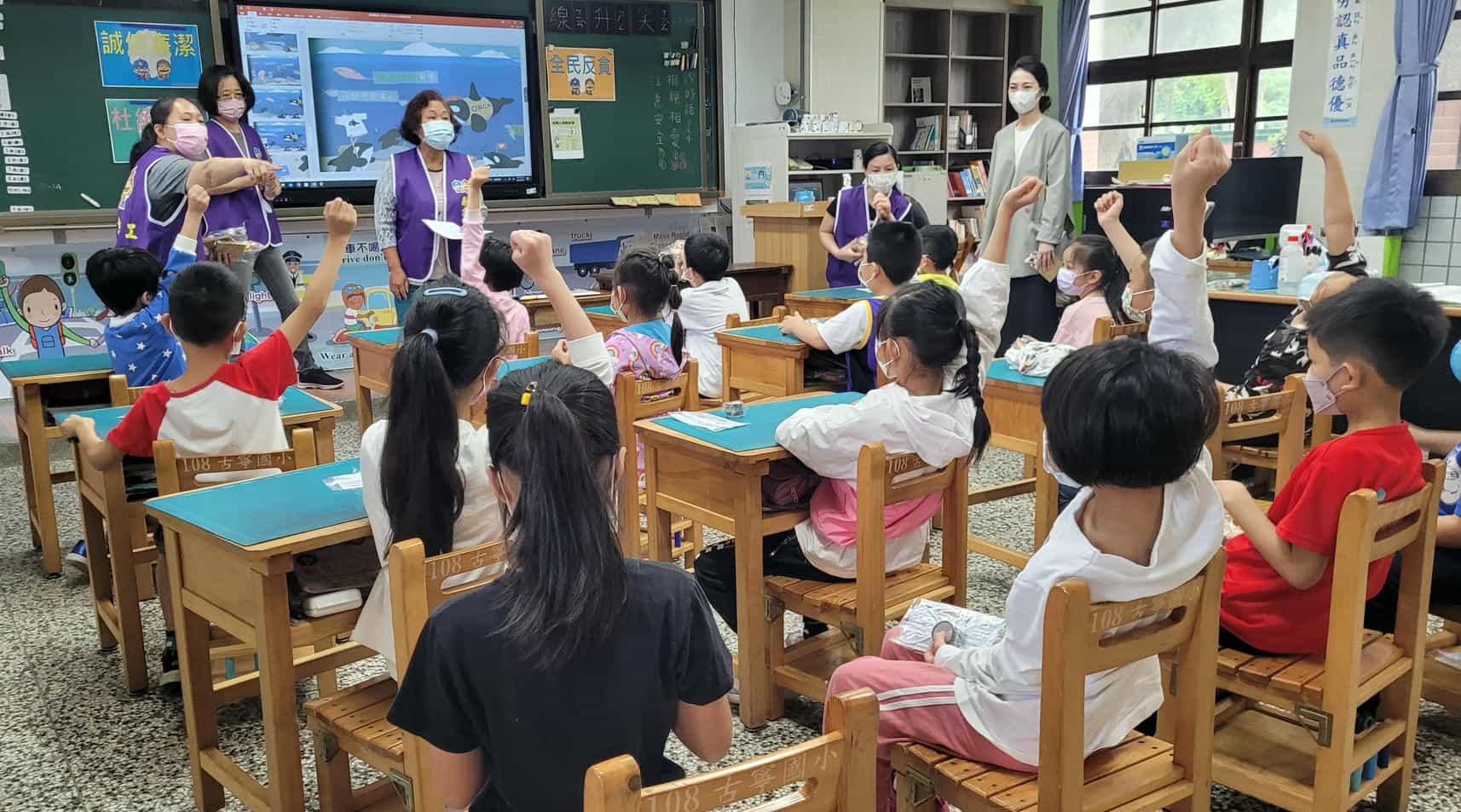 廉潔品格教育從小扎根 金門縣政府政風處&廉政志工校園宣導列車開抵古寧國小-廉政志工講師陳能美說故事與古寧國小學童互動過程