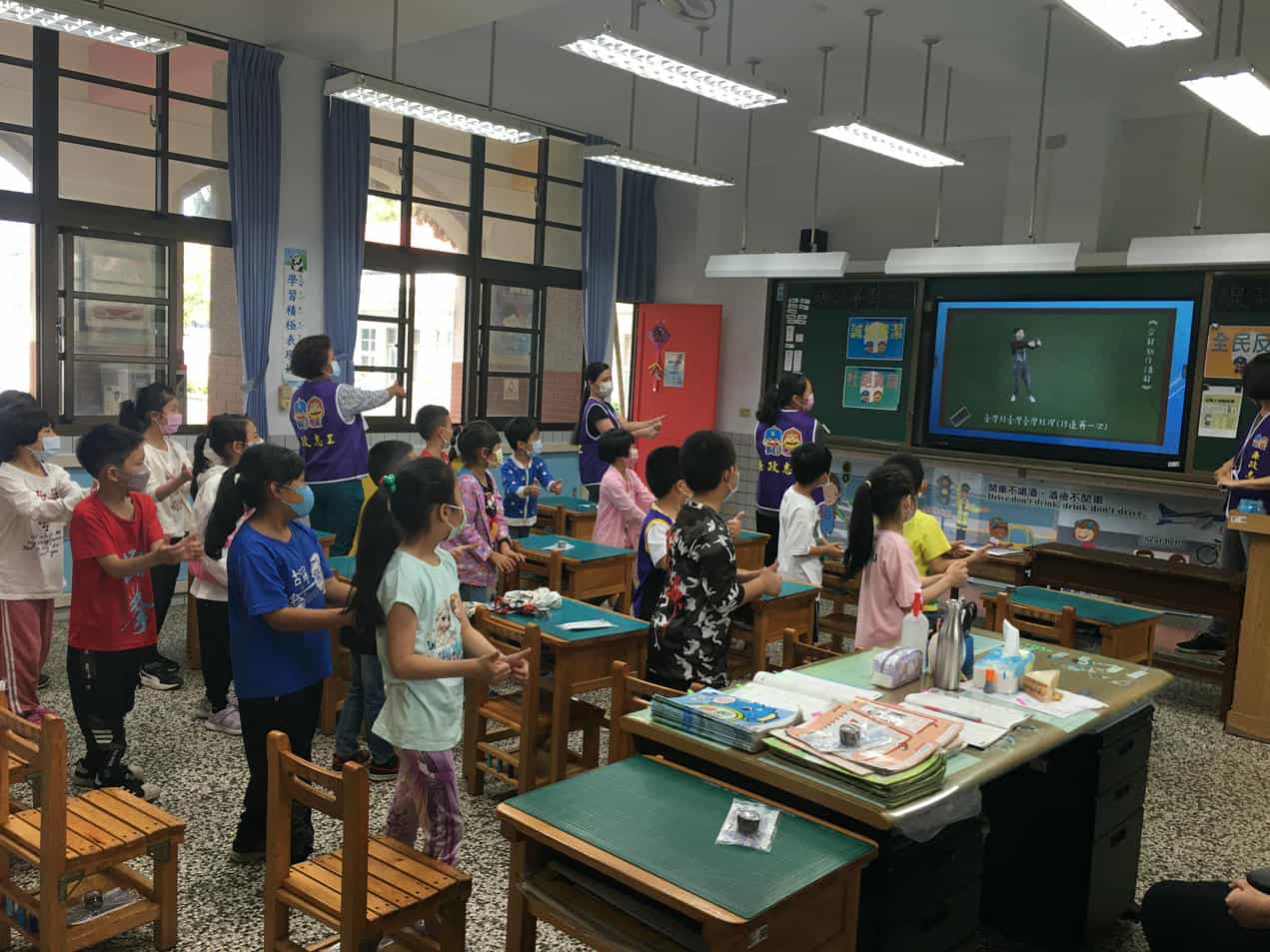 廉潔品格教育從小扎根 金門縣政府政風處&廉政志工校園宣導列車開抵古寧國小-校園廉政宣導過程中帶領學童們跳「臺灣鯨讚護鯨」舞