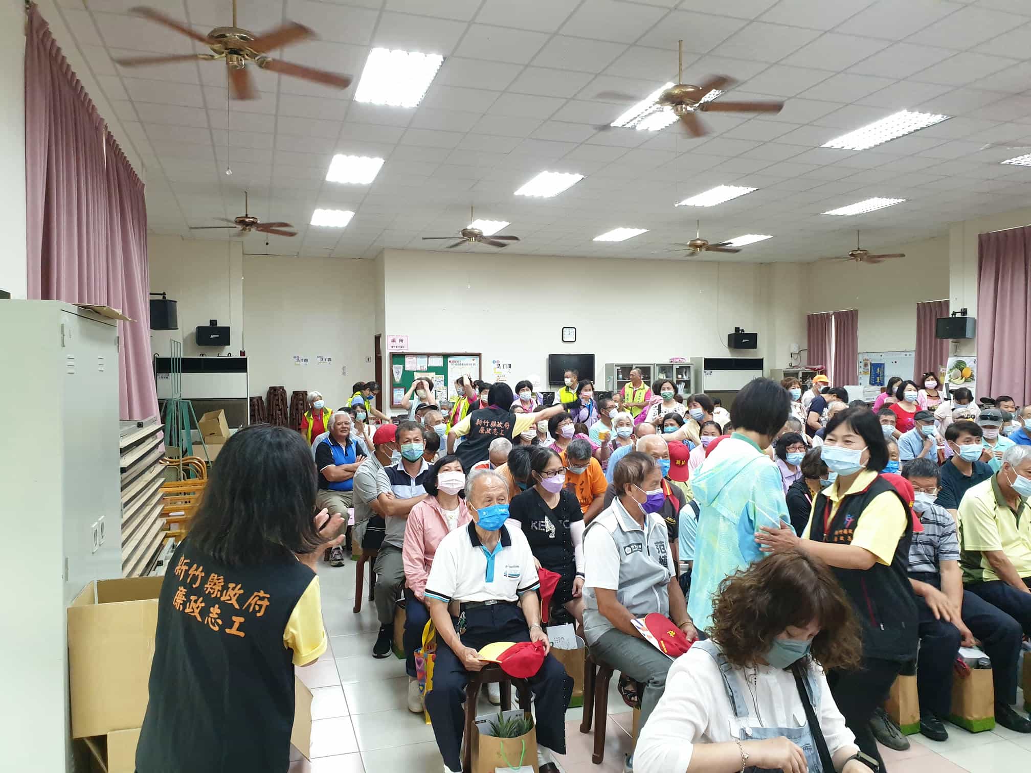 新竹縣政府政風處廉政志工協助竹北市公所辦理「里鄰反貪反賄反詐騙」暨「臺美21世紀貿易倡議反貪腐章節」廉政宣導教育訓練-新竹縣政府政風處廉政志工於活動現場協助有獎徵答行政事務