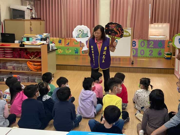 新竹市政府政風處攜手廉政志工辦理「廉手做燈籠」反貪宣導活動-孩踴躍表達對故事的想法