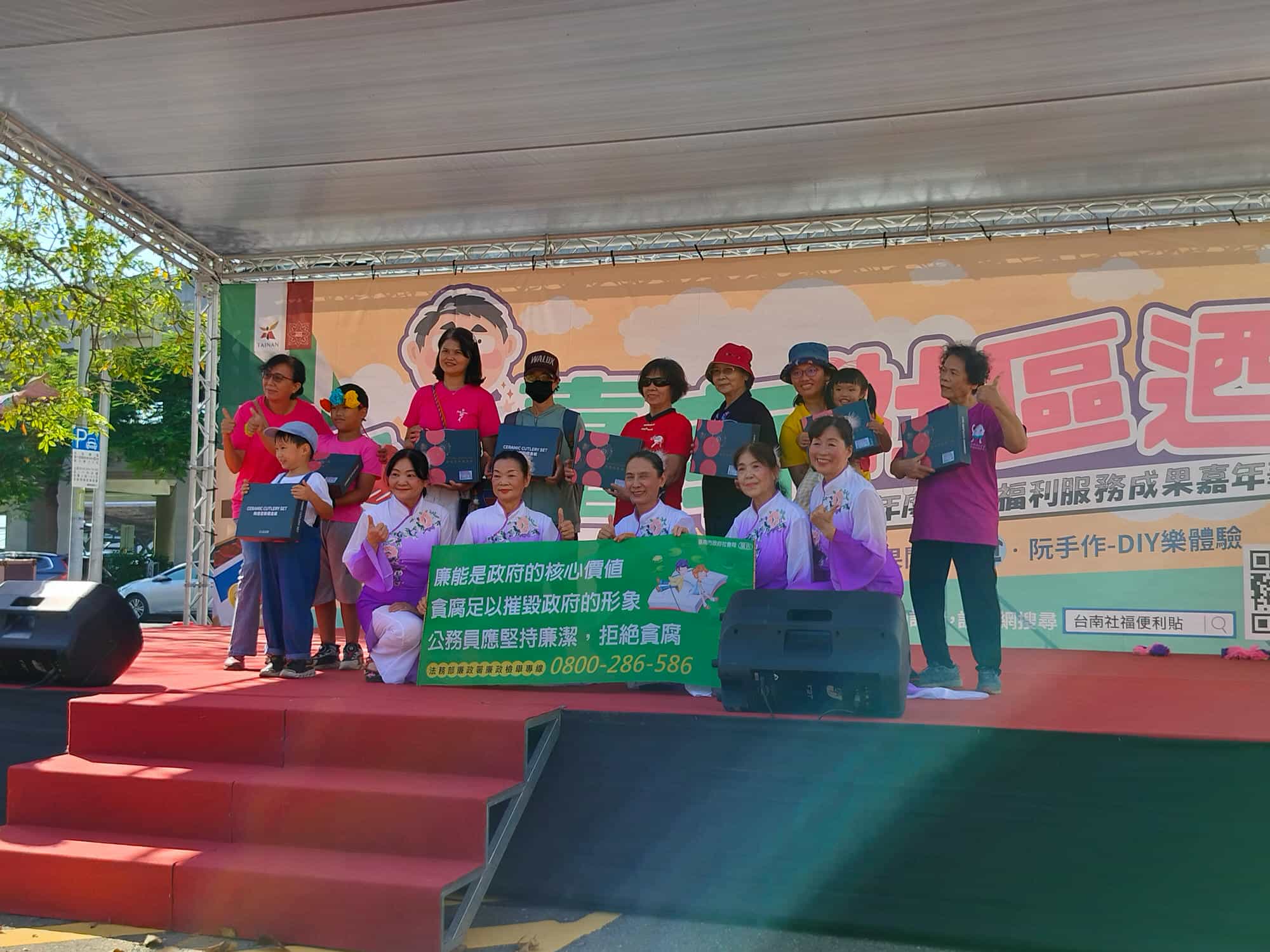 「來阮台南社區迺」服務成果嘉年華,臺南市政府政風處廉政志工表演暨宣導-廉政志工以廉政標語宣導與廉政有獎徵答獲獎民眾合影