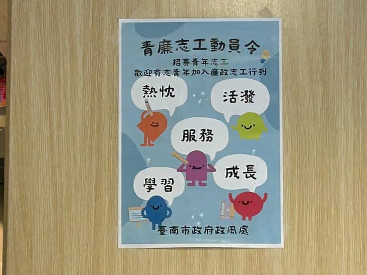 由校園誠信營隊活動拓展到青廉志工招募~臺南市政府政風處-會場張貼廉政志工招募海報